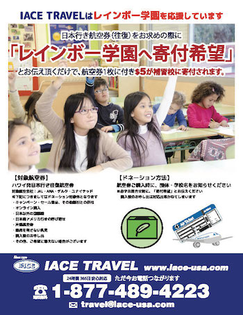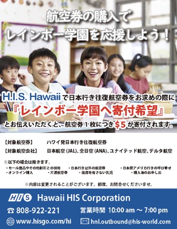 H.I.S. ハワイ で日本行き往復航空券をお求めの際に『レインボー学園へ寄付希望』とお伝えいただくと、航空券 1枚につき$5が寄付されます。