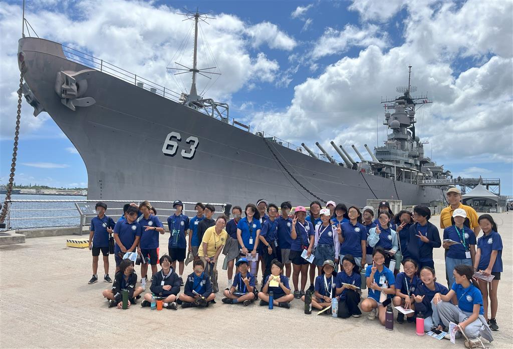 次に訪れたパールハーバーでは80年前の戦争の歴史が色濃く残る戦艦ミズーリを見学しました。歴史の舞台となったその甲板に立ち、子供たちは戦艦の規模の大きさに圧倒された様子でした。初めて知るその奥深さに目を丸くしながら、ガイドさんの説明に耳を傾け、平和へのねがいと歴史の重さを肌で感じることができました。