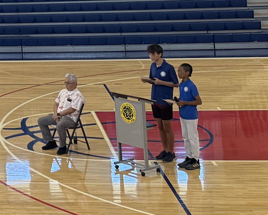10月4日、後期始業式が行われ、新たに11名の編入生を迎えました。始業式の司会は、中学3年生が務めました。司会の生徒が「姿勢を正しましょう」と呼びかけると、幼稚部から中学部まで全児童・生徒が、ぴんと背筋を伸ばします。式は、司会による「はじめの言葉」に始まり、校歌斉唱、そして児童・生徒代表の言葉へと続きました。代表の児童・生徒たちは、後期に向けての目標や楽しみにしていることを、次のように発表しました。